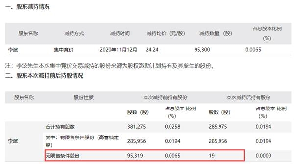 公告显示,股东李波以24.24元减持了9.53万股的公司股份,套现231万元。虽然金额不算高,但这已经是将其手上的流通股几乎全部减持了,剩下的是暂时无法售出的有限售条件股份。