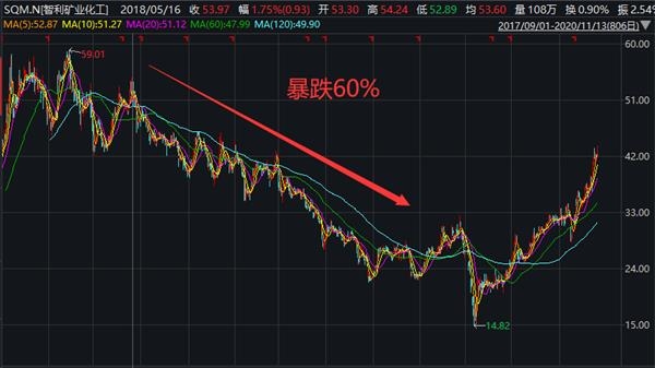 结果收购没多久,锂价格就出现了见顶,而SQM的股价也跟随着出现了大幅的下跌。一度暴跌超60%,虽然近期股价有所回升,但是距离65美元/股还是查了近30%。