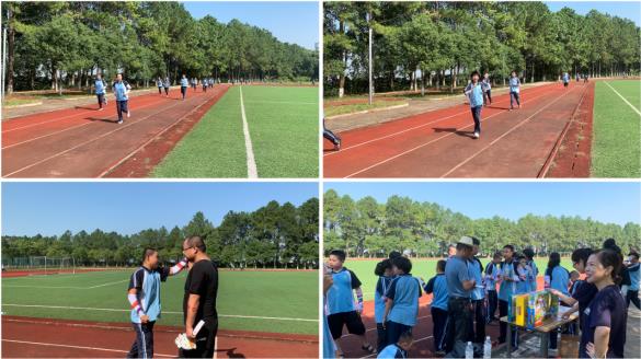 宣讲结束后,由校方陈老师带领孩子们依次进入校园操场,体育老师带领孩子们做跑步前的热身运动,我们和老师们一起发放护臂、脸贴等物品。
