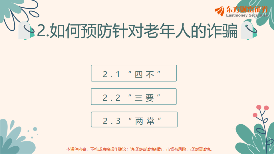 随着社会的发展,针对老年人的诈骗案件日益增多。为了提高老年人的防诈骗意识,切实保护好老年人的“钱袋子”,东方财富证券投资者教育基地联合成都市第二社会福利院于2023年10月17日开展了“防范养老诈骗,掌握预防手段”为主题的投资者教育活动。此次活动由成都沙河铺街证券营业部承办,共有20名老人进行现场活动的参与,活动同步开通线上直播。
