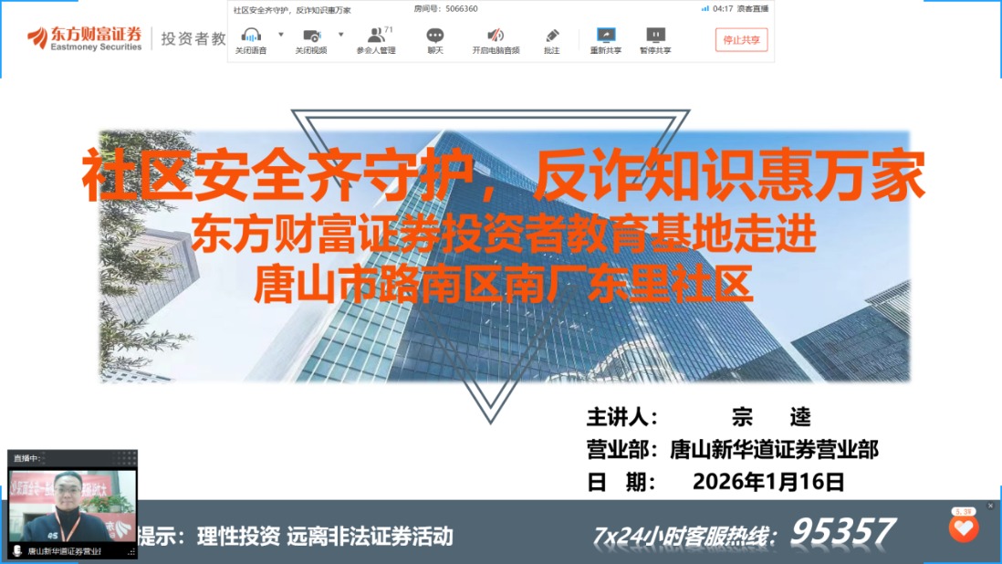 为维护广大居民合法权益,增强社区居民的金融反诈意识,弘扬理性投资理念,普及金融知识,筑牢社区安全防护网,营造安全文明、和谐无诈的社区环境,东方财富证券投资者教育基地联合河北省唐山市路南区南厂东里社区于2026年1月16日举办了一场以“社区安全齐守护,反诈知识惠万家”为主题的投资者教育活动。本场活动通过现场宣讲与线上平台同步直播方式,为97位社区居民(线下26人,线上71人)献上了一场精彩的金融反诈知识讲座,本场投教活动由唐山新华道证券营业部承办,本场投教活动取得圆满成功。